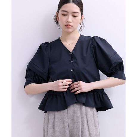 袖のタックや、太めのカフス、裾のフリルが華やかなコンパクトなブラウス。
