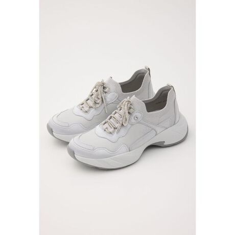 STACCATO人気のきらきらリボンがアクセントとなった、ボリューム見えながら最軽量で、異素材コンビのディテール(レザー×サテン×ニット)にこだわったライトニットスニーカー。履き口はニット素材なのでスリッポンタイプで着脱も簡単。高さを感じにくく、弾力あるNEW型ソールで跳ねるような履き心地。一見スポーティー見えながら、華やかなリボンがカジュアルすぎず、レディらしい足元に魅せてくれます。※シューレースリボン部分はデザインです。調節は不可です。