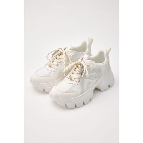 STACCATO人気の定番ボリュームソールスニーカーに新デザインが登場。スポーティーに見えながら、レース&レザーコンビがハードになりすぎず、エレガントな印象に仕上げました。正面から見ると、リボンをモチーフにしたレザーデザインがポイント。サイドゴム仕様で、シューレースを外さずスリッポン感覚で着用いただけます。ツイストチャームや装飾パーツは、気分に合わせて取り外し可能です。 ※シューレースの調整・付け替えも可能です。※装飾部分への引っ掛けや衝撃等にご注意ください。