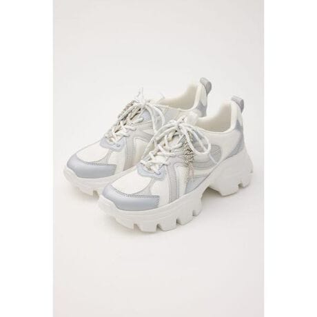 STACCATO人気の定番ボリュームソールスニーカーに新デザインが登場。スポーティーに見えながら、レース&レザーコンビがハードになりすぎず、エレガントな印象に仕上げました。正面から見ると、リボンをモチーフにしたレザーデザインがポイント。サイドゴム仕様で、シューレースを外さずスリッポン感覚で着用いただけます。ツイストチャームや装飾パーツは、気分に合わせて取り外し可能です。 ※シューレースの調整・付け替えも可能です。※装飾部分への引っ掛けや衝撃等にご注意ください。