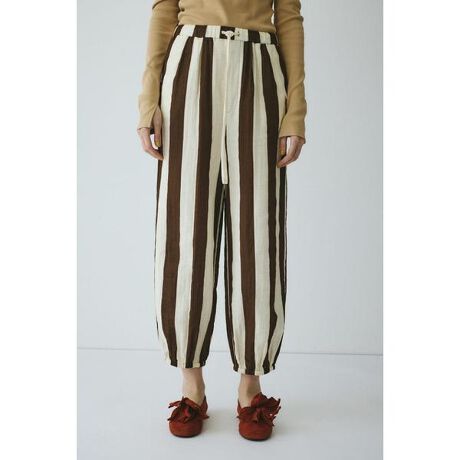 HeRINが得意とするガーゼ素材に、印象的なストライププリントを施したパンツウエストはゴム仕様となっており、肌触りのいいリネンタッチ素材と合わせてリラックス感たっぷりな仕様となっています。同素材の(530JSM30-0851 Stripe gauze blouse)とのセットアップスタイルもオススメですが、季節が進むにつれて簡単になるトップスに対して、ストライプパンツを軸とした印象的なスタイリングを魅せることが出来るオススメアイテムです。ストライプガーゼパンツ[注意事項] ※画像の商品はサンプルです。実際の商品と仕様、加工が若干異なる場合があります。 ※画像の商品は光の照射や角度、お使いのモニター環境により、実物と色味が異なる場合がございます。 ※着用、お取り扱いの際は、アテンションタグをご確認ください。