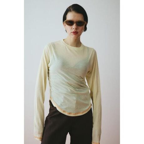 背中のメローがポイントのシアートップスメローや裾のステッチの配色がHeRINらしい1枚。清涼感のある肌触りのいいカット素材を使用しているので、着心地も抜群。程よいシアー感でロングシーズン活躍してくれます。シアーメロートップス[注意事項] ※画像の商品はサンプルです。実際の商品と仕様、加工が若干異なる場合があります。 ※画像の商品は光の照射や角度、お使いのモニター環境により、実物と色味が異なる場合がございます。 ※着用、お取り扱いの際は、アテンションタグをご確認ください。