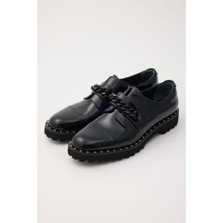 [型番:350JS148-8300]クールで程よくマニッシュな、スタイリッシュなフォルムに、ワイドめのアウトソール。ウェルト部分にはスタッズピンを打った、モードでエッジのきいた1足。チェーンベルト部分はベルクロタイプなので調節がきくのも◎。モノトーンコーデから、あえて外したフェミニンな装いにも相性抜群です。※チェーンや装飾部分への引っかけや、衝撃・破損等にご注意ください。