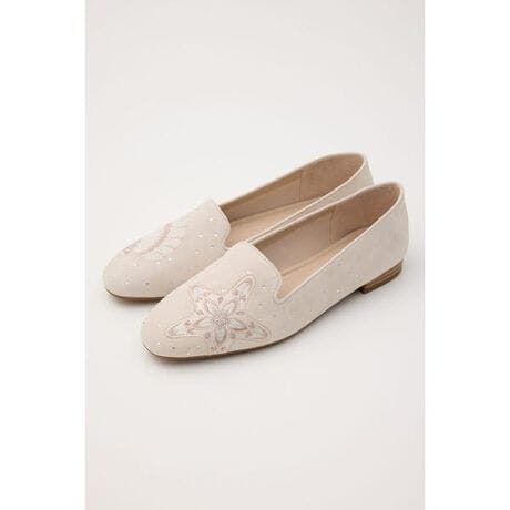 [型番:350JS148-8310]『SEA』をテーマにした独創的なデザインで個性が光るオペラシューズ。細かなディテールが心くすぐる、きらきらとした水面をイメージしたストーンを散りばめ、絶妙なカラー使いのキュートな刺繍には、右足は『シェル』、左足は『ヒトデ』をモチーフにしたユニークで大胆なデザイン。左右非対称でデザインが違うのもおすすめポイント。ペールカラーなので意外と主張しすぎず、スタイリングに馴染みやすいです。クッション性もよく、軽量です◎