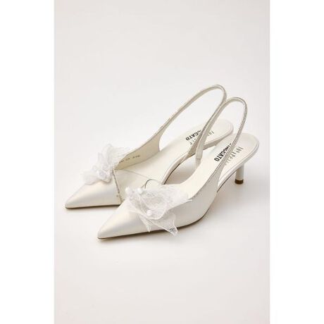 [型番:350JS111-1110]唯一無二のデザインにこだわった華やかなオープンパンプス。軽やかになびく繊細なメッシュチュールを花びらモチーフに見立て、水滴のようなうるっとしたボールをトッピング。さらにスリングされたベルト部分には、極細のストーンラインを装飾しました。注目を集めること間違いない、上品で優美な1足です。※繊細なつくりのため、モチーフ部分やベルトのストーン装飾への引っかけ、衝撃・破損等にご注意ください。