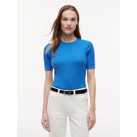 コットンケーブルファインゲージクルーネックショートスリーブセーター