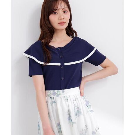 トレンド感のあるケープディテールが目を引くニットトップス。前立てはフェイクボタン仕様で開く心配なく着用いただけます。スカートもパンツも合わせやすく、清涼感のある糸を使用しているので長く活躍できます。