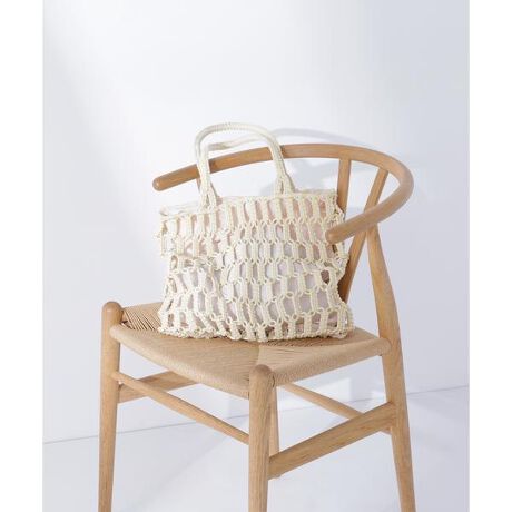 コットン紐をバイカラーでマクラメ編みに仕上げた、70年代ムード漂うトートバッグ。ナローシルエットやワイドなボトムスとも相性の良いバランスです。都会的かつ洗練されたカラーも魅力。A4サイズ対応で、デイリーに使いやすいです。※モデルの着用画像の場合、光の当たり具合により、実際の色味と異なって見えることがございます。色味は、商品単体の画像をご参照ください。