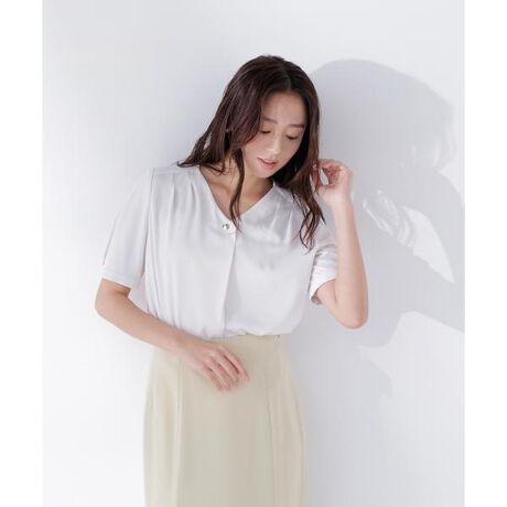 すっきりとしたVネックデザインのブラウス。肩ヨークにタックを入れて、キレイめな印象に仕上げています。ニュアンス感のあるライトゴールドカラーのメタル釦がアクセント。袖はワンタックのパフスリーブで二の腕をカバー。どんなボトムスにも合わせやすく、オフィスシーンでも着回せます。<素材>オフカラーでも透けにくい、フルダルジョーゼットの合繊素材を使用しています。<詳細>仕様・前ボタン裏地・なし透け感・なし / 光沢・なし / 伸縮性・ややあり生地の厚さ・普通※モデルの着用画像の場合、光の当たり具合により、実際の色味と異なって見えることがございます。色味は、商品単体の画像をご参照ください。