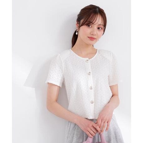 表面加工が可愛いカットカーディガン。柔らかく伸縮性がある素材に、薄手の肩パットを入れており、シルエットをキレイにキープします。肩パットのほどよいボリュームが今年らしく高見えするデザインです。微配色のゴールドカラー釦が大人っぽい印象プラス。ボトムス次第でキレイめにもカジュアルにも着回せます。