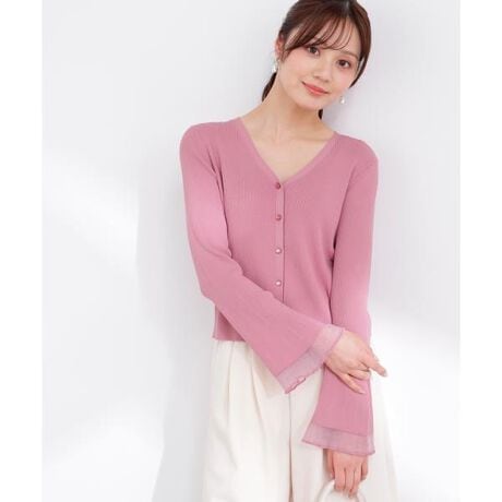 袖口がシアー素材に切り替わったカーディガン。袖口のみシアーデザインでコーディネートに取り入れやすく、フレアスリーブが女性らしい雰囲気を演出します。前ボタンを留めてトップス風に着こなせます。