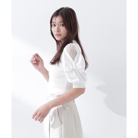袖山のシアー切り替えがフェミニンなニット。身頃はシンプルながら、程よい肌見えと立体的なスリーブで華やかな印象に見せてくれます。透け感が控えめなのでトレンドをさりげなく取り入れながら、オンにもオフシーンにも活躍できる万能アイテムです。<素材>春夏に涼しく着やすいシャリ感ある糸を使用しています。<詳細>仕様・開閉なし裏地・なし透け感・あり / 光沢・なし / 伸縮性・あり生地の厚さ・普通※モデルの着用画像の場合、光の当たり具合により、実際の色味と異なって見えることがございます。色味は、商品単体の画像をご参照ください。