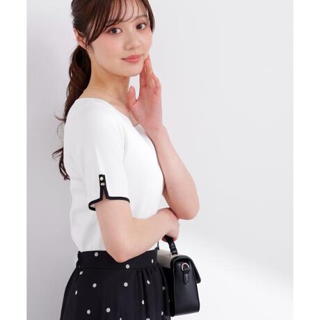 デコルテをキレイに見せるシンプルニット。袖口にスリットとメタルボタンをあしらい、品の良いアクセントになっています。スカートもパンツも合わせやすく、オンオフ問わず活躍。袖口が配色のグレーとホワイトカラーに加えて、無地ピンクカラーを揃えています。