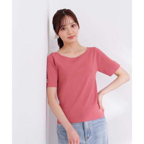 デコルテをキレイに見せるシンプルニット。袖口にスリットとメタルボタンをあしらい、品の良いアクセントになっています。スカートもパンツも合わせやすく、オンオフ問わず活躍。袖口が配色のグレーとホワイトカラーに加えて、無地ピンクカラーを揃えています。