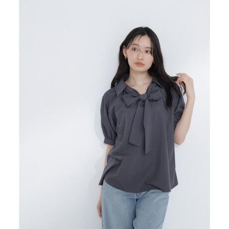 顔まわりを華やかに見せてくれるリボンタイ半袖ブラウス。スキッパーネックとリボンタイを組み合わせたデザインは、自由に結べるリボンタイで首元の開き具合を変えられます。リボンタイは取り外しが出来、シンプルなスキッパーブラウスとしても着ていただけます。一枚でもジャケットインでも映え、ボトムス次第でONにもOFFスタイルにも着回せます。<素材>キレイな表面感の合繊ブロード素材を使用しています。<詳細>仕様・開閉なし裏地・なし透け感・なし / 光沢・ややあり / 伸縮性・なし生地の厚さ・普通※モデルの着用画像の場合、光の当たり具合により、実際の色味と異なって見えることがございます。色味は、商品単体の画像をご参照ください。