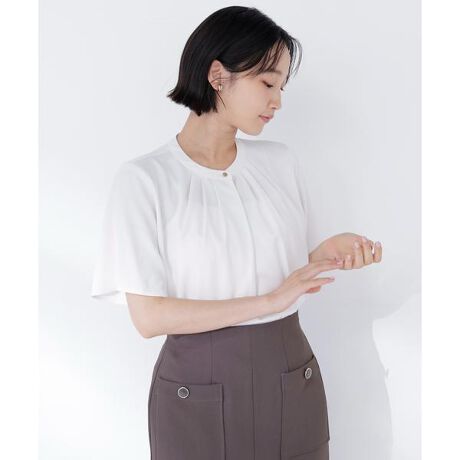 首元のタックときらりと光るゴールドカラー釦で華やかなポイントが効いたブラウス。気になる二の腕をカバーするやさしいフレアスリーブが、涼しげで女性らしい印象に見せてくれます。ジャケットインでも映える上品なネックデザインなので長く着ていただけます。<素材>オフカラーでも透けにくい、フルダルジョーゼットの合繊素材を使用しています。<詳細>仕様・前ボタン裏地・なし透け感・なし / 光沢・なし / 伸縮性・ややあり生地の厚さ・普通※モデルの着用画像の場合、光の当たり具合により、実際の色味と異なって見えることがございます。色味は、商品単体の画像をご参照ください。