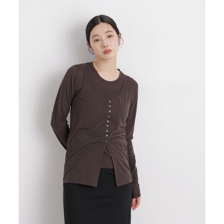 繊細な透け感の天竺生地を使用した、ロンTとタンクトップの同素材セットアイテム。タンクトップはウエストより下には釦を付けていないため、着用時は自然に開き、長めのスリットのような表情に。セットでもそれぞれ単品でも着回しやすく、季節を通してスタイリングの幅を広げてくれる万能アイテムです。