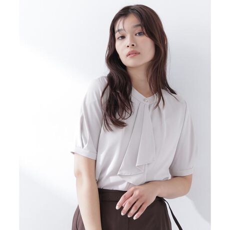 NBB定番人気!華やかなラッフルボウタイ半袖ブラウス。首元がやや詰まったネックラインがきちんと感を演出してくれます。ラッフルは固定されており、結ぶ手間なく着るだけでサマになるデザイン。セットインスリーブや身頃はコンパクトなサイズ感でジャケットインしやすく、顔まわりを華やかに演出しながら、オフィスシーンに活躍してくれます。<素材>オフカラーでも透けにくい、フルダルジョーゼットの合繊素材を使用しています。<詳細>仕様・前ボタン裏地・なし透け感・なし / 光沢・なし / 伸縮性・ややあり生地の厚さ・普通※モデルの着用画像の場合、光の当たり具合により、実際の色味と異なって見えることがございます。色味は、商品単体の画像をご参照ください。