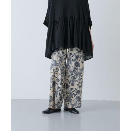 シンプルなトップスを合わせるだけでスタイリングが決まる一品。絵画のようなタッチが大胆ながらもどこか優しく、大人の着こなしに寄り添います。チュニックやワンピースとのレイヤードも素敵ですよ。透け感が気になりにくく、裏地の無い軽やかな仕立てを採用。程よい太さのストレートシルエットは、下半身のラインを拾わずスッキリと着ていただけます。ウエストは総ゴムで楽な着心地なのも嬉しいポイント。簡単に着映える装いが完成するイージーパンツです。