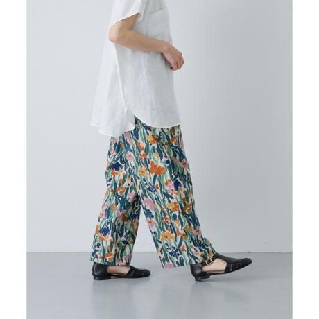 シンプルなトップスを合わせるだけでスタイリングが決まる一品。絵画のようなタッチが大胆ながらもどこか優しく、大人の着こなしに寄り添います。チュニックやワンピースとのレイヤードも素敵ですよ。透け感が気になりにくく、裏地の無い軽やかな仕立てを採用。程よい太さのストレートシルエットは、下半身のラインを拾わずスッキリと着ていただけます。ウエストは総ゴムで楽な着心地なのも嬉しいポイント。簡単に着映える装いが完成するイージーパンツです。