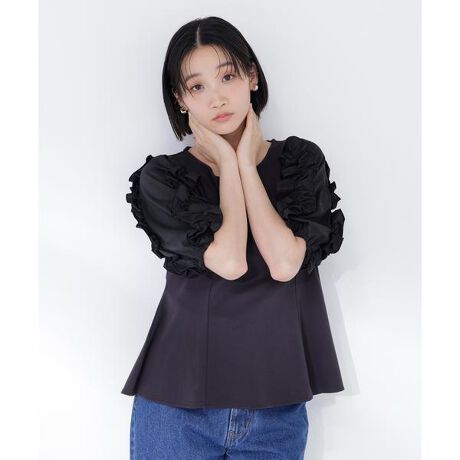 袖に柔らかな布帛素材をドッキングした軽やかな着心地のカットソー。身頃はややハリ感のあるカットソー素材で、体のラインを拾いにくくキレイなシルエットをキープします。ボリューム感のあるフリルスリーブが華やかさをプラスし、二の腕をさりげなくカバー。ウエストから広がるペプラムシルエットで、自然なスタイルアップを叶えます。デイリーからキレイめまで幅広いシーンで活躍してくれます。<素材>身頃はややハリ感のあるカットソー、袖は柔らかな布帛生地を使用しています。<詳細>仕様・開閉なし裏地・なし透け感・なし / 光沢・なし / 伸縮性・あり生地の厚さ・普通 ※モデルの着用画像の場合、光の当たり具合により、実際の色味と異なって見えることがございます。色味は、商品単体の画像をご参照ください。