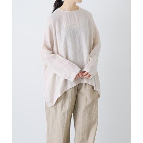 オーバーサイズが抜けた雰囲気のプルオーバー。風を通す素材感は長袖ながらも夏場でも快適に着用いただけます。身幅はワイドに設定し、着ると両サイドの裾が穏やかに落ちて奥行きのあるシルエットに。袖はそのままでも、ラフにまくるのもこなれ感が増しておすすめです。ロングシーズンお楽しみいただける1枚。