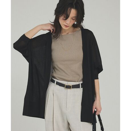 上品な透け感の編地が軽やかに映える、接触冷感機能付きのシアーカーディガン。