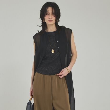 パンツスタイルにさらりと重ねるだけで、qualiteらしいきれいめレイヤードが完成します。