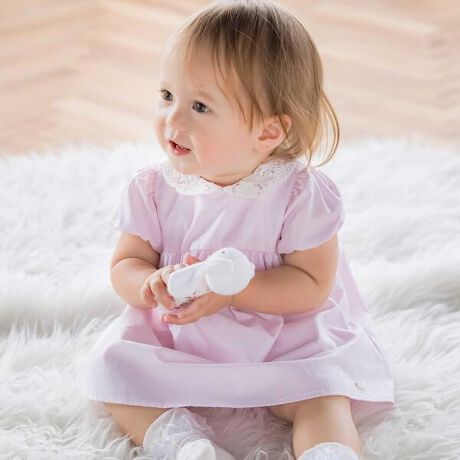 レース襟とパフスリーブが可愛らしいベビー用ブルマ付きワンピース。