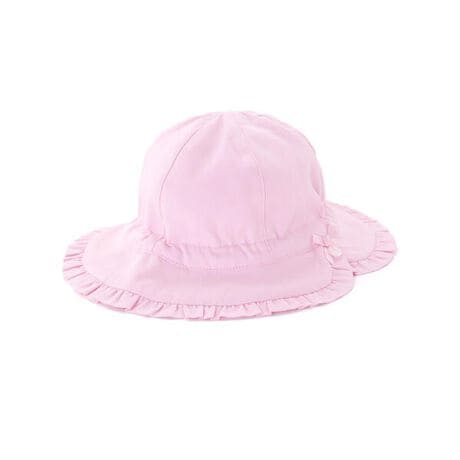 ギャザーフリルを縁に施したデザインが可愛らしい女の子ベビー用リボンハット。