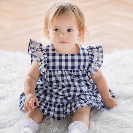 ギンガムチェックとお袖にあしらわれたお花の刺しゅうが可愛らしいベビー用ブルマ付きワンピース。