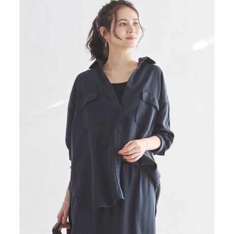 ゆったりとしたオーバーサイズでありながら、落ち感のある素材が身体にしなやかになじむカジュアルシャツです。サイドに施されたボタンを留めることで、カシュクール風のデザインにもアレンジできる2WAY仕様が魅力です。襟を少し後ろに抜いて着ることで、大人の余裕を感じさせるこなれた雰囲気を演出できます。ボトムスにはリブニットパンツやIラインスカートなど、すっきりとしたシルエットのアイテムを合わせるとバランス良くまとまります。また、同素材のパンツやスカートと合わせたセットアップスタイルもおすすめです。カラーは、ナチュラルで優しい印象のベージュ系(#033)、深みのある色合いがシックなダークブラウン系(#035)、洗練された落ち着きのあるネイビー系(#075)の3色展開です。
