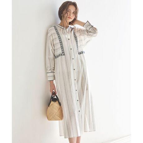 素朴で温かみのある風合いが魅力の、SLOWらしいストライプ素材を使用したシャツワンピースです。部分的に施された配色の刺繍が、シンプルなデザインの中に洗練されたアクセントを加えています。首元はバンドカラーですっきりと仕上げることで、顔周りを明るく見せつつ大人の抜け感を演出しました。一枚での着用はもちろん、リブニットパンツやデニムパンツなどのボトムスとレイヤードすることで、トレンド感のあるこなれたスタイリングを楽しめます。休日のリラックスタイムからお出かけまで、幅広いシーンで活躍する一着です。ナチュラルな雰囲気を引き立てるホワイト系(#101)のみの展開です。