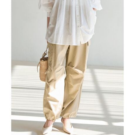 大人が着こなせるよう洗練された雰囲気に仕上げた、パラシュートカーゴパンツです。雪上カモフラージュ用のミリタリーパンツであるスノーカモパンツのディテールをベースに、ハリ感のある素材を用いることで立体的でゆったりとしたボリュームシルエットを表現しました。裾のドローコードを絞ることでシルエットに変化をつけられ、合わせるシューズや気分によって着こなしのアレンジを楽しめます。コンパクトなトップスと合わせてメリハリをつけたり、シャツやニットと合わせたリラックススタイルなど幅広いコーディネートに活躍します。体のラインを拾わないサイズ感で気負わず穿けるのも嬉しいポイントです。カラーは、どんなコーディネートにも馴染む柔らかなベージュ系(#033)と深みのある色合いがシックな印象を与えるモスグリーン系(#053)の2色展開です。