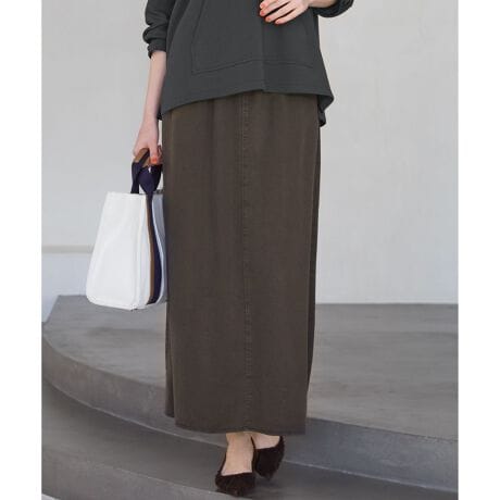 シンプルだからこそ幅広いスタイリングに活躍する万能なセミフレアロングスカートです。腰回りはすっきりとさせつつ、裾に向かって程よく広がるフレアラインにこだわることで、甘くなりすぎない大人の女性らしいシルエットに仕上げました。ウエストは総ゴム仕様になっているため、締め付け感がなくストレスフリーな穿き心地で、リラックスしたい休日や長時間の移動にも最適です。ボリュームのあるニットやスウェットなどと合わせたメリハリのあるカジュアルスタイルがおすすめですが、同素材のシャツと合わせてセットアップで着用すれば、統一感のあるこなれた着こなしも楽しめます。カラーは、ナチュラルで優しい印象のベージュ系(#033)、深みのある色合いがシックなダークブラウン系(#035)、洗練された落ち着きのあるネイビー系(#075)の3色展開です。