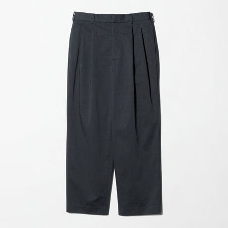 膨らみのある綿ポリエステル生地を採用し、2タックでヒップやわたりにゆとりを持たせながら、裾に向かってテーパードさせたワイドスラックス仕様。