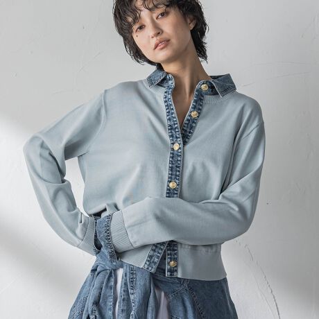 カーディガンにデニムシャツをレイヤードしたような、ドッキングデザイン。