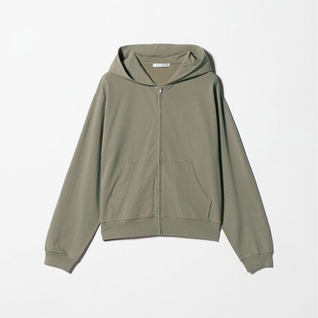 コットンのミニ裏毛を使用した薄手のフードジップパーカー。