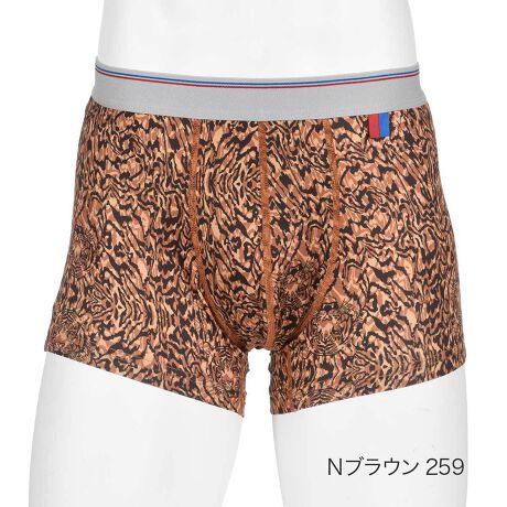 強烈な存在感を放つタイガー柄を全身にまとった、大胆でワイルドなデザインのボクサーブリーフです。素材には、伸縮性に優れ、肌触りが非常に滑らかなベア天竺生地を採用しています。この高い伸縮性により、体の動きに合わせて柔軟にフィットし、常に快適でストレスのない履き心地を提供します。デザインは、リアルな筆致と迷彩を組み合わせたようなブラウン系のタイガー柄(虎柄)総柄プリントが特徴です。さらに、虎の顔が浮き出るように描かれており、力強くエネルギッシュな雰囲気を演出します。仕様は使いやすい前閉じタイプです。ウエストゴムは、グレーをベースに赤と青のラインが入ったトリコロール調のデザインで、ワイルドな柄の中にスポーティーなアクセントを加えています。また、赤と青の小さなフラッグモチーフがあしらわれており、細部にもこだわりが感じられる一枚です。
