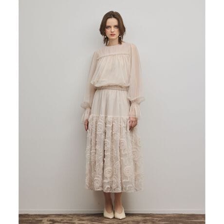 [型番:0326121349]チュールに刺繍、プリーツ加工を施したスカート。プリーツ加工でふんわりとボリューム感を出し、刺繍で華やかさをプラス。同シリーズでおつくりしたチュールタイブラウス【品番:0326141349】のご用意もございます。※こちらのモデル着用画像はサンプル品を撮影しております。実際の商品と仕様、加工、サイズが若干異なる場合がございます。予めご了承くださいませ。