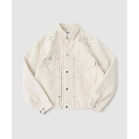 ボタニカルや鳥の柄を繊細なモノトーン刺繍で施した、無染色のロウホワイトデニム。