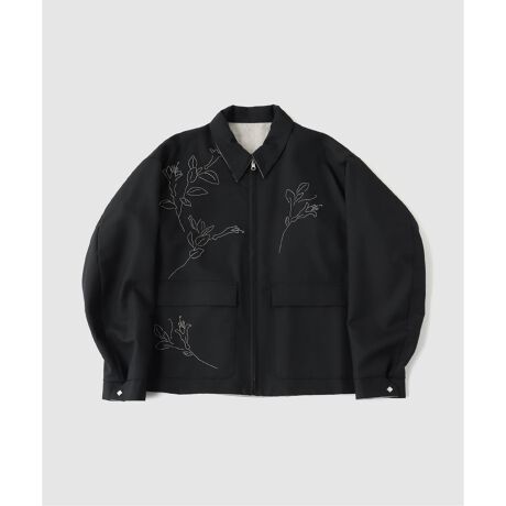 ボタニカルや鳥の柄を繊細なモノトーン刺繍で施した、表はブラックのサマーウールと裏はリネン素材の組み合わせ。