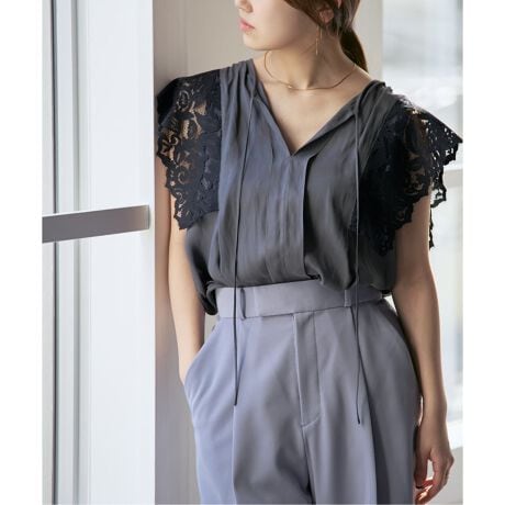 袖口に配色レースをドッキングした軽やかにフェミニニティームードを満喫できるブラウス。