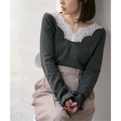 Vネック開きに沿うようにレースをトリミングし1枚着トップスとしても完成度高く、カジュアルに着られるカットソーの中に女性らしい抜け感をプラスしています。