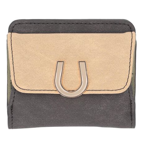 【トライカラーと蹄鉄が魅力的】コンパクトなのに収納力も抜かりない、トライカラーの二つ折り財布【コンパクトなのに収納充実】お札ポケットにカード8枚分のスロットも備え、薄くても中身はしっかり整理できる!【BOX型小銭入れで取り出し楽々】パッと大きく開くホック式のコインケースだから、小銭が見やすくてレジ前でもたつかない安心の使い心地◎【馬蹄モチーフの上品な佇まい】さりげなくあしらわれた蹄鉄デザインとトライカラーの配色が、大人可愛い雰囲気を演出してくれる一品。【外側ポケットでサッとアクセス】前面にICカード、背面にレシートと、よく使うものをすぐ取り出せる便利なポケットが前後に配置〇【軽やかフェイクレザー】柔らかくて手になじむ合成皮革を採用し、毎日持ち歩きたくなるコンパクトウォレット♪