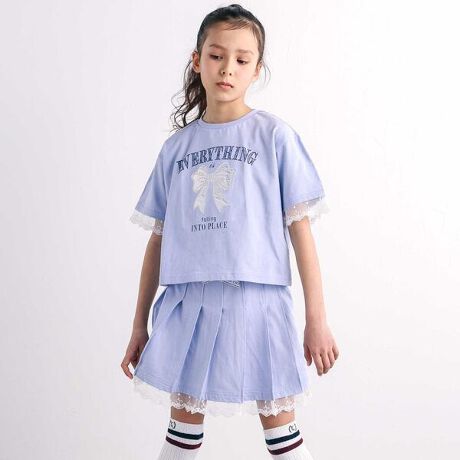 Tシャツの裾にはスカラップレースをあしらい、両袖にはリボンや蝶々、ロゴが入ったテープをプラス。