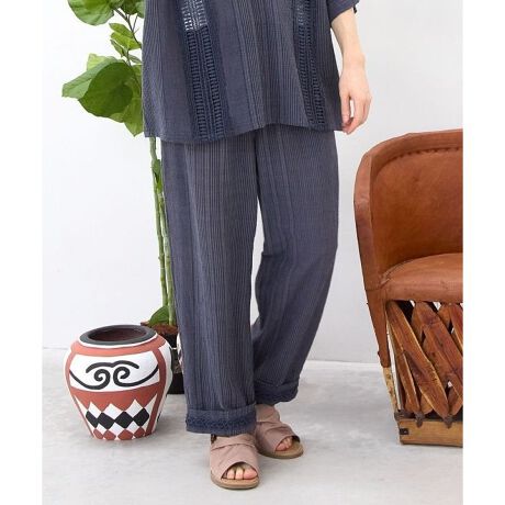 [型番:IMC-6105-2026]南インド伝統の織柄を用いた綿素材のストレートパンツ。裾のレース切り替えがアクセントになり、リラックス感のある一着。