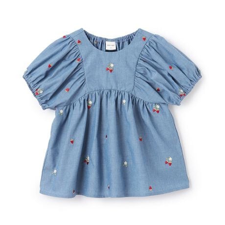 キュートないちごの刺しゅうを全体にちりばめたチュニックです。ギャザーでシルエットに膨らみをプラスし、女の子らしい雰囲気に仕上げました。バックネックはお着替えしやすいゴム仕様。シンプルなパンツやレギンスを合わせるとバランス良く決まります。内側にお名前を記入できるタグつき。