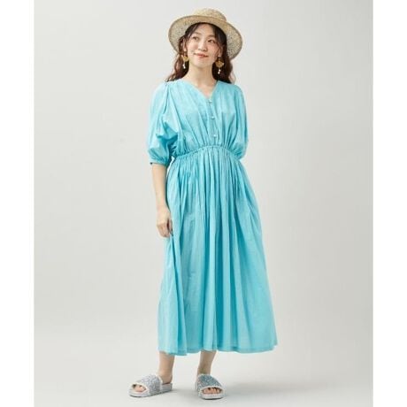 [型番:IFO-6106-2026]インド綿のやさしい風合いに控えめな刺しゅうを添えたワンピース。スタイルアップを演出するシルエット。シャーベットカラーでコーデを華やかな印象に。