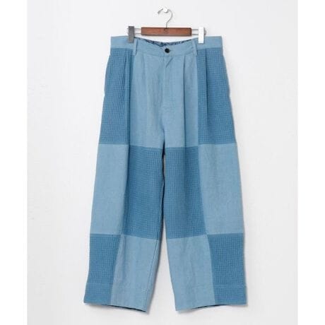 [型番:IDS-6137-2026]インディゴ染めとパッチワークが映えるメンズパンツ。裾やポケット内側に「ろうけつ染」風プリントを忍ばせたこだわりのデザイン。